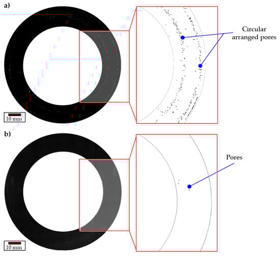 Bearing washers prior and after forging were analysed on a modified PVA TePla SAM 301 system (PVA TePla Analytical Systems GmbH, Westhausen, Germany). Two different transducers, as depicted in Table 4, were used. After welding, the C-Scans of the washer showed indications in a depth of 2.5 mm from the component surface, which corresponds approximately to the position of the joining zone. These indications were identified as circularly arranged pores aside the welding seams with a typical size of 10 µm, up to 20 µm (see Figure 9a). Figure 9b depicts a bearing washer after forging, showing only a few very small pores. In comparison, the number of pores due to the welding process was reduced drastically.