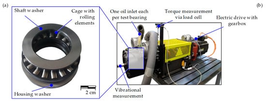 The test setup is conventionally used for the dynamic-mechanical testing of rolling bearing lubricants [22]. The procedure is regulated in the DIN 51819 standard. The test was carried out with lubricating oil at 70 °C and 250 rpm (cf. [7]). To stabilize the bearing temperature, the test head was cooled by convection. A preload of 40 kN was applied to the hybrid bearings via disc springs. The load is imposed via a hydraulic press, whereby the axial force is measured with a force transducer HBM C2 (nominal force 100 kN) and a carrier frequency amplifier HBM SCOUT55 (Hottinger Baldwin Messtechnik GmbH (HBM), Darmstadt, Germany). The test run was monitored by vibration measurement and shut down if a limit level of 150% of the steady state signal was exceeded. Each test run consists of two bearing assemblies; i.e., a total of four hybrid washers and two cages including rollers were used per test run (cf. Figure 10a). Twenty thrust bearing washers were investigated in five test runs. The tests were carried out according to the sudden death strategy, in which all bearings are replaced after the failure of the first bearing of a test run. In the following, the minimal test durations of the failed bearing washer are examined.