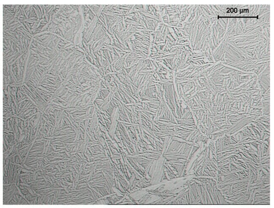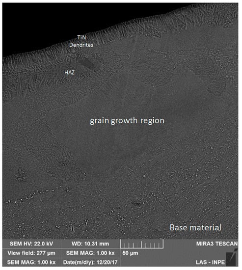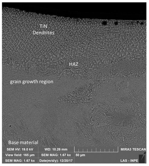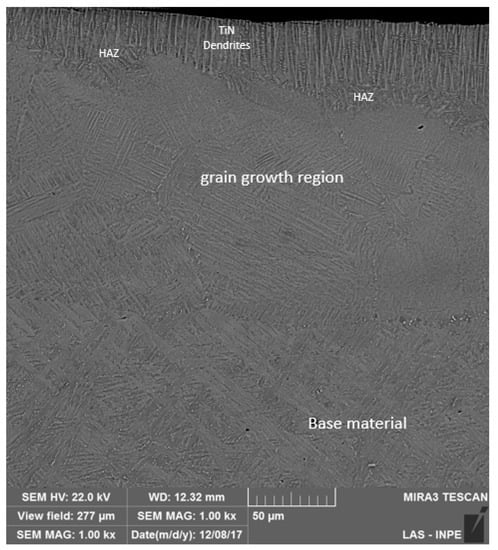 The microstructure of Ti-6Al-4V with Widmanstätten microstructure after laser nitriding is shown in Figure 2, Figure 3 and Figure 4 and it is possible to identify a modification of its morphology. The microstructure of the nitreted surface consists of a laser melted region, a heat affected zone (HAZ), and a region with an increase of the grain size and the substrate. The microstructure of the laser melted region consists of a thin layer followed by a growth of TIN dendrites [20]. The Heat affected zone (HAZ) is found after the melted zone and it is formed by needle-shaped structures called titanium martensite (Ti-α’). This occurs due to the laser-material interaction that increases the temperature up to β-phase field. After its quick cooling, the martensitic transformation in this region is observed [9]. An increase of average grain size in the Heated Affected Zone is also observed, after laser nitriding of the Ti6Al4V with Widmanstatten microstructure. This can be related to higher temperatures in the material, that can cause diffusion along the grain boundaries and increase their size. This behavior is beneficial in the material creep resistance. A smaller grain boundary area, is related to a lower oxygen diffusion along the grain boundaries [13,14,21].