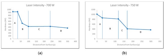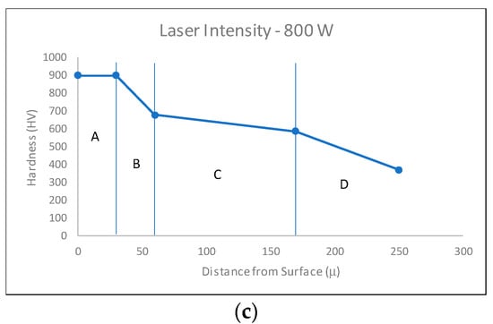 Hardness profile of Ti-6Al-4V alloy after nitriding process: (A) Melted region; (B) Heat affected zone; (C) Grain growth region; (D) Base material. (a) Laser Intensity—700 W; (b) Laser Intensity—750 W; (c) Laser Intensity—800 W.