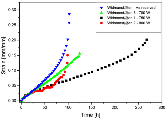 The creep tests were conducted on Ti-6Al-4V alloy for the received Widmanstätten microstructure specimens and on the laser nitrided specimens, considering the load (125 MPa) and temperature (600 °C). The creep curves (Figure 6) exhibit normal behavior which consists of well-defined primary, secondary and tertiary stages. A short initial period with a decrease at the primary creep rate could be observed, that is associated with the hardening process due to the accumulation of dislocations. However, a constant creep rate is observed at a larger period of creep life. This can be associated with a balance between the recovery and hardening process [13].
