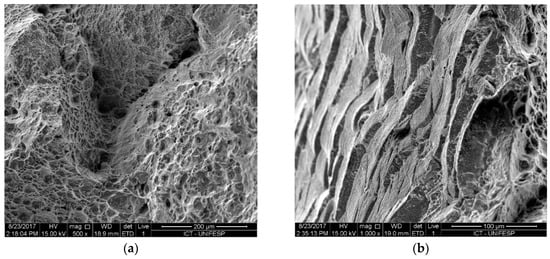 Post creep test fracture surfaces of Ti-6Al-4V specimens are shown in Figure 7. The fracture mode has exhibited ductile fracture mechanism with the narrowing phenomenon and development of microcavities in the central region of the fractured specimens. The test conditions were characterized by the formation and coalescence of microcavities with different sizes and shapes, with the deepest present in the central region of the sample. Specially, in the condition of higher laser power (800 W), smooth marks of deformation are observed in the edges of the specimen, with fragile characteristics. This is in accordance with shorter fracture time observed for the highest power condition used for the laser nitriding process, which reduces the material ductility in this region.