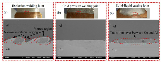 The interface macro-appearance and micro-morphologies of three kinds of interface structures, shown as: (a) explosion welding joint, (b) cold pressure welding joint and (c) solid-liquid casting joint.