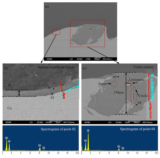 Figure 2c shows the microstructure of the vortex region. This region consisted of a vortex-like structure formed between the compound and the pure metal, which was consistent with [13]. There were typical defects such as pores, cracks, and looseness, as shown in Figure 2c. The micro-morphology analysis of the interface between Cu/Al explosive welding, showed a large deformation at the joining interface, partial melting of the organization, oxide inclusions, pores, and cracks. The interface structure was extremely uneven, and a large number of brittle intermetallic compounds were generated in the vortex-like region. The thickness of this region reached up to approximately 330 μm, and typical defects such as cracking occurred in the compound layer. The Al:Cu atom ratio at the points 03 and 04 indicated that most compounds in the vortex region was possible Al2Cu phases, based on preliminary EDS analysis and XRD phase analysis experiments in [12].