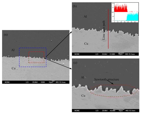 Figure 3 shows the typical interface morphology of the Cu/Al cathode conductive head produced by cold pressure welding. It could be seen that there was no distinct layer of compounds with distinct gray values on the whole interface. A larger multiple of morphological images with a linear scanning composition distribution of the cold pressure welding interface is shown in Figure 3b. This indicated that there was no obvious diffusion and compound generation during the cold pressure process. However, the interface structure exhibited complex peak and valley morphologies. Serrated interpenetration features, as shown in Figure 3c, were formed on the interface. This sawtooth structures could produce an interlocking effect, which can obviously enhance the bonding strength between Cu and Al [23].