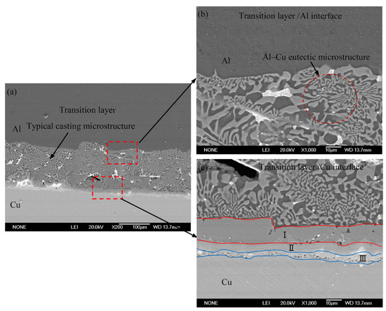 For the process of the Cu/Al solid-liquid casting, the mutual diffusion and reaction between liquid aluminium and solid copper formed a metallurgical bond with a certain degree of thickness in the transition layer. Figure 4 showed the typical interface morphology of the Cu/Al cathode conductive head produced by solid-liquid casting. It could be found that the transition layer consisted mainly of an Al-Cu eutectic microstructure (Al2Cu+Al) and a partial white slag inclusion. The Al2Cu phase presented a continuous reticular structure that was widely distributed in interfacial transition layer. Figure 4b,c respectively show the detailed microstructure of the transition layer/Al interface and the transition layer/Cu interface. The transition layer/Al interface shows the irregular intercalation characteristics between the Al matrix and the compound, as shown in Figure 4b. In contrast, the transition layer/Cu interface presented a layered distribution with different grayscale values, as illustrated in Figure 4c. There were three distinct layers (I, II and III, shown in Figure 4c) between the reticular structure and the Cu metal matrix. Layers I and II showed uniform structural characteristics. However, dense hole defects were distributed in the III layer region. The width of the interface transition layer of the solid-liquid casting was approximately 200–250 μm.