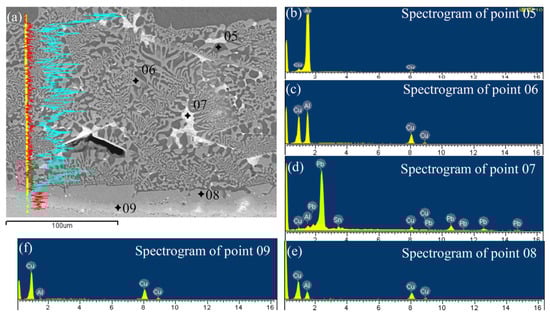 Figure 5 showed the distribution of elements that are perpendicular to the interface, and the point component of the analysis spectrogram shown in the solid-liquid casting joint. It could be found that the content of Al and Cu elements were changed consistent with the change of microstructure. EDS spot scan analysis was carried out to determine the possible composition of different regions. The corresponding spectrogram of the different points is shown in Figure 5b–f. The results of the EDS analysis conducted on points 05–09 in Figure 5a are shown in Table 2. This indicates that the reticular zone consisted of an Al matrix (the region of point 05), Al2Cu (the region of point 06) and the slag inclusion (the region of point 07). The layer near the reticular structure (corresponding to layer I in Figure 4c) could be identified as the AlCu phase in view of the atom ratio (n(Al):n(Cu)) that was approximately equal to 1:1 in the positions of point 08. In Layer II, point 09 was a copper matrix with a small amount of Al. This indicated that part of the surface layer of the copper matrix was eutectically melted during the casting of the aluminum liquid.
