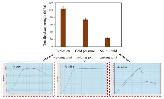 Interface bonding strength is of great importance the for Cu/Al conductive head in practical applications. The shear strength of three types of Cu/Al conductive heads were tested, and the fracture mechanisms was analyzed. In this paper, three test samples were selected for each process, and two tensile shear samples were prepared from each test sample. Therefore, there were six tensile samples for each process. The specimens were cut into Φ 10 mm × 40 mm, consisting of half Al and half Cu. The shear strengths and the typical stress-strain curves are shown in Figure 6. It could be seen from the figure that the interface shear strength of the explosive welding Cu/Al joint was the highest, with an average value 104 MPa. This was mainly because of the good metallurgical bonding and special interface structures present. The interfacial shear strength of the joint prepared by cold pressure welding method was about 74 MPa. This might be provided by the special interlocking structures at the interface, although there was no obvious metallurgical bonding layer between Al and Cu. The interface shear strength of the Cu/Al conductive head prepared by the solid-liquid casting method was the lowest, about 23.5 MPa. This was mainly due to the obvious defects of the Cu/Al composite interface which contained mainly shrinkage, porosity, inclusions, and intermetallic compounds near the Cu side. The eutectic structure with a large degree of thickness at the interface, and its obvious solidification defects such as shrinkage holes and inclusions, resulted in a high resistance from the interface transition layer, and serious power consumption when energized.