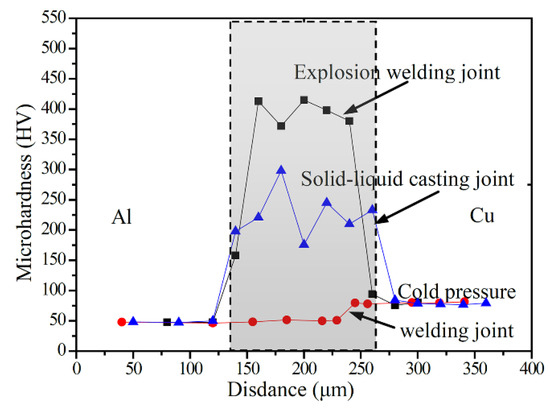 Because the thickness of Cu/Al transition layer was usually below the millimeter-level, microhardness was chosen. In this paper, the microhardness of Cu/Al interfacial transition layer was measured using the TUKON2100 Vickers microhardness tester. The loading was 10 g and the dwell time was 10 s. The microhardness distributions of the three kinds of interface structures were obtained, as shown in Figure 7. The transition layer of the explosive welding joint had a microhardness range of 372–413 HV. The transition layer of the solid-liquid casting joint had a microhardness range of 176–298 HV. It could be seen that the microhardness of the transition layer on the interface of Cu/Al conductive head prepared by explosive welding and solid-liquid casting was much higher than that of the matrix. The value depended on the composition and microstructure. Also, the width of the high-hardness region was consistent with that of the interfacial transition layer. The microhardness of the Cu/Al interfacial transition layer prepared by cold pressure welding did not increase significantly, mainly because no obvious metallurgical reactions were found on the interface.