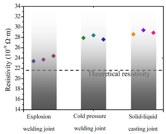 The resistivities of three types of Cu/Al joints were estimated and are shown in Figure 8. According to the binary metal resistivity formula (as shown in equation 1/r = VAl/rAl + VCu/rCu, where r is the theoretical resistivity, VAl, VCu, rAl, rCu are the volume fraction of Al (50%), the volume fraction of Cu (50%), Al resistivity (measured value 28.4 × 10−9 Ω·m), and Cu resistivity (measured value 17.5 × 10−9 Ω·m)), respectively and related values, and the theoretical resistivity of the Cu/Al bimetallic composite structures r = 21.6 × 10−9 Ω·m. It was be found that the resistivity of the explosion welding joint was about 24 × 10−9 Ω·m which was slightly higher than the theoretical resistivity. The resistivity of cold pressure welding and the solid-liquid casting joint was about 28 × 10−9 Ω·m, which was close to that of the Al metal. Compared with Cu and Al, the intermetallic compounds had a high resistivity (such as Al2Cu 80 × 10−9 Ω·m and A14Cu9 142 × 10−9 Ω·m). The presence of the intermetallic compounds will increase the resistivity of the Cu/Al bimetallic composite structures.