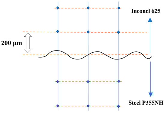 In order to analyze the influence of the post-weld heat treatment on the microstructure of the obtained joint, the first sample has been investigated in the as-welded state, the second sample has been subjected to heat treatment of stress relief annealing (at 620 °C for 90 min), and the third sample was subjected to the normalizing (at 910 °C for 30 min). The parameters of the post-weld heat treatment have been selected for base material (P355NH), which plays a load-bearing role in the investigated clad-plate. As a result, for the further investigation the three samples were obtained: a sample after explosive welding (InSt EXW), sample after post-weld stress relief annealing (InSt HTR) and sample after post-weld normalizing (InSt HTN). In order to perform the microstructure analysis, the samples have been subjected to the metallographic preparation. The cut samples were mounted in hot-mounting resin, ground with abrasive paper of 80, 320, 600, 1200 and 2400 gradations and polished using diamond paste of 1 µm gradation. In order to reveal the microstructure of steel P355NH, 2% nital etchant with etching time of 5–10 seconds was used and in case of Inconel 625 alloy, acetic glyceregia (15 mL HCl 38%, 10 mL of acetic acid 99%, 5 mL HNO3 65%, 1–2 drops of glycerol) with etching time of 15 min. Grain size of the materials has been measured with Mountains Map 7 software. The microstructure of the samples was investigated using light microscope OLYMPUS LEXT OLS 4100 (Military University of Technology, Warsaw, Poland) and scanning electron microscope (SEM) Jeol JSM 6610 (Military University of Technology, Warsaw, Poland) equipped with energy-dispersive x-ray spectroscopy (EDS) and back-scattered electron (BSE) detector. The diffusion zone, which has been formed in the post-weld normalizing (InSt HTN) sample was investigated using scanning transmission electron microscope (STEM) Hitachi S-5500N (Military University of Technology, Warsaw, Poland). The sample for STEM was prepared using dual beam system Hitachi NB-5000 (Military University of Technology, Warsaw, Poland). In order to establish the strain hardening of analyzed samples the Vickers microhardness test was performed with loading of 100 g. Microhardness distributions were prepared for each sample. The first two measurements were performed 200 µm from the joint line, in the layer of Inconel 625 alloy and in steel P355NH as shown in Figure 2. Subsequently, measurement imprints were guided towards the edge of the samples, at the distance of 2000 μm.