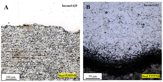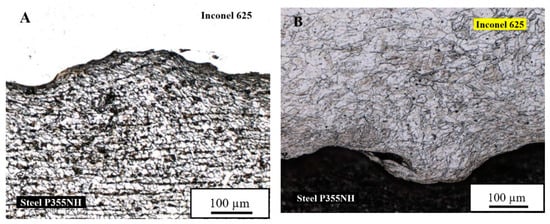 The obtained joint has a wavy structure, typical for explosively welded bond. The grains of both materials in the joint zone are deformed due to severe plastic deformation during collision, as it can be observed after etching of steel P355NH (Figure 4A) and Inconel 625 alloy (Figure 4B).