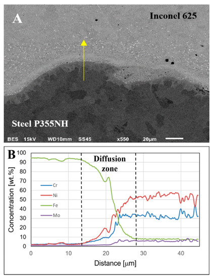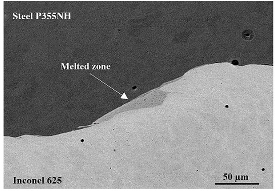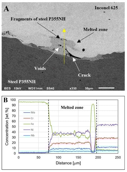 The observations using scanning electron microscope (BSE) show the occurrence of melted zones in the joint, where the two welded materials have been stirred together (Figure 5A). In the melted zones, the investigation revealed the presence of joint imperfections in the form of both cracks and fragments of steel P355NH surface layer, which underwent partial fragmentation during explosive welding process, as evidenced by linear analysis of the chemical composition (Figure 5B). The results of the chemical composition analysis indicate on the highest participation of Inconel 625 alloying elements in this area with small fluctuations near to the steel P355NH fragment.