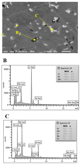 Scanning electron microscope observations revealed the presence of two types of precipitates in Inconel 625 alloy—light precipitates (suggesting a high concentration of alloying elements heavier than nickel) and dark precipitates (high concentration of alloying elements lighter than nickel). The size of precipitates is about 0.5–1 µm (Figure 10A). In order to establish a chemical composition of precipitates EDX area analysis has been performed. Dark precipitates are characterized by high concentration of chromium and increased participation of molybdenum (Figure 10B). At the same time, it has been found that chemical composition of light precipitates has high molybdenum and niobium content (Figure 10C). Additionally, the presence of carbon in both types of precipitates has been reported.