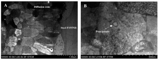 Observations of the diffusion zone performed on scanning transmission electron microscope allow to investigate the grainy microstructure of this area. It has been stated that in terms of grain structure the diffusion zone consists of two subzones: area of equiaxed grains (at side of Inconel 625 alloy) and area of columnar grains (at side of steel P355NH) (Figure 12A). In both cases, the microstructure consists of ultrafine grains with their size within the range of 400 nm–1 μm. Predominantly, the finer grains close to Inconel 625 are equiaxed and columnar grains close to P355NH have slightly larger size. Additionally, it has been reported the occurrence of precipitates with their width about 50 nm in the diffusion zone (Figure 12B).