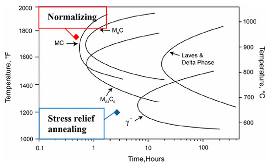 Inconel 625 isothermal transformation diagram [35]. Parameters of stress relief annealing and normalizing have been marked.