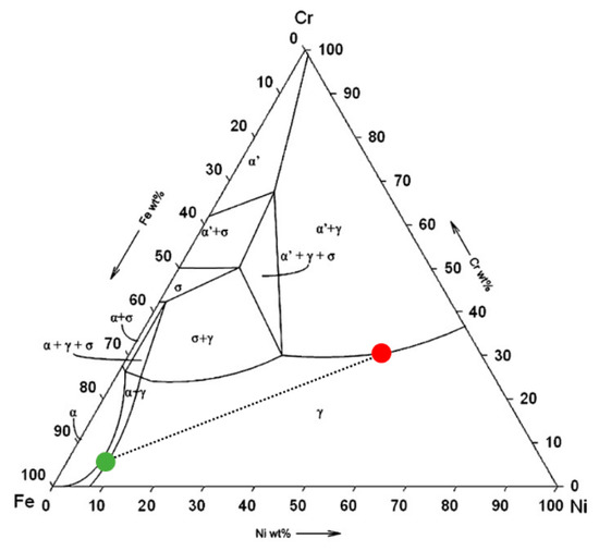 Fe–Ni–Cr phase diagram [44] together with marked compositions of: iron-rich section (green dot) and nickel-chromium-rich section (red dot).