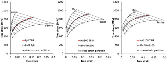 - The strain partition between the soft ferrite and the hard bainite/martensite constituents was estimated. The partition is mainly related to the ferrite hardening rate and this is linked to austenite stability and the ferrite grain size.