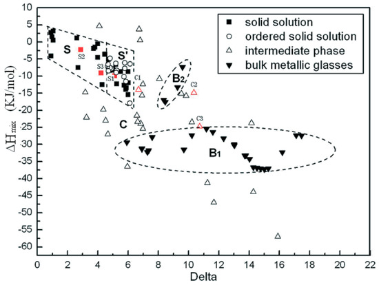 Zhang et al. study on the relationship between SS stability, atomic size difference (), and enthalpy of mixing () was one of the earliest theoretical studies attempted to predict the crystal structures and phases of MPE alloys [17]. According to their study, SS in MPE alloys forms when satisfying Hume-Rothery rule [18], and [17]. Figure 4 shows how SS and ordered SS microstructures in MPE alloys can be achieved when and [17].