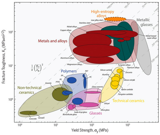 Fracture toughness as a function of yield strength for a wide variety of materials, including MPE alloys (high entropy alloys) (this figure is from Reference [86]).