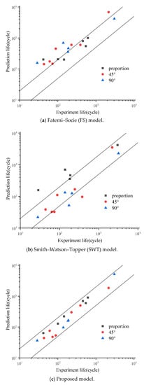 It can be seen from Figure 2 that multiaxial fatigue life predicted by the SWT model is dangerous, while the result predicted by the FS model is conservative. Meanwhile, the proposed model has the best prediction ability for multiaxial fatigue life. In the case of proportional loading, the results predicted by the FS model, most of which are located in the two-factor band, are superior to that of the SWT model. In the case of non-proportional loading, the results from the SWT and FS models are not ideal, outside of the two-factor band (Figure 2a,b). For GH4169 alloy, the agreement between the results of the theoretical predictions and those achieved by experiments is satisfactory (Figure 2c).