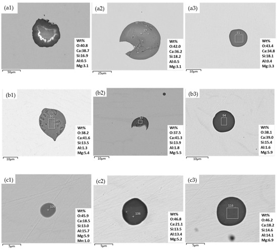 Morphology and composition of typical inclusions in samples: (a) typical inclusions at the end of AOD; (b) typical inclusions at the end of LF refining; (c) typical inclusions in the tundish.