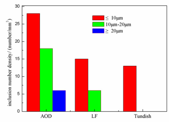 The variations of the number density and the size of inclusions during the AOD-LF-CC production process were determined and are shown in Figure 3. Small inclusions (≤10 μm) were dominant in all the samples. Larger inclusions (≥10 μm) decreased in number density during the different stages of steelmaking. Large inclusions with a size larger than 20 µm were present in liquid steel after AOD treatment, but were all adsorbed by the slag after LF refining, so there were no large inclusions from LF refining to the continuous casting tundish. Most inclusions were smaller than 10 µm at each stage, and their number density decreased throughout the process.