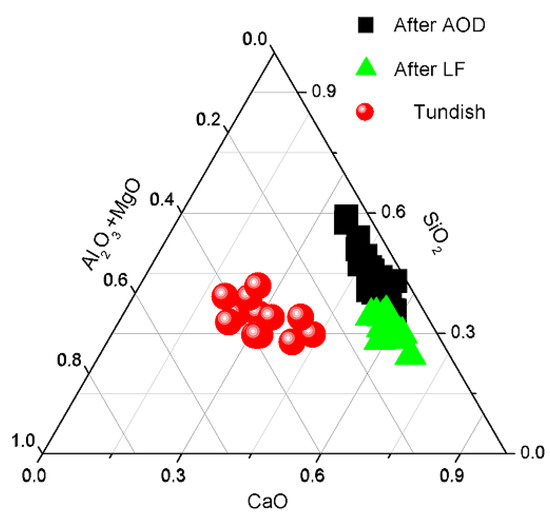 The composition of inclusions in the 304L stainless steel in the AOD-LF-CC process was determined and is shown in Figure 4. The composition of inclusions was mainly CaO-SiO2, with a small amount of Al2O3 and MgO in the AOD stage. The basicity and (Al2O3 + MgO) content of inclusions in LF were higher than for inclusions in AOD. In the tundish, there was a significantly higher content of (Al2O3 + MgO) in inclusions than that at the LF refining stage.