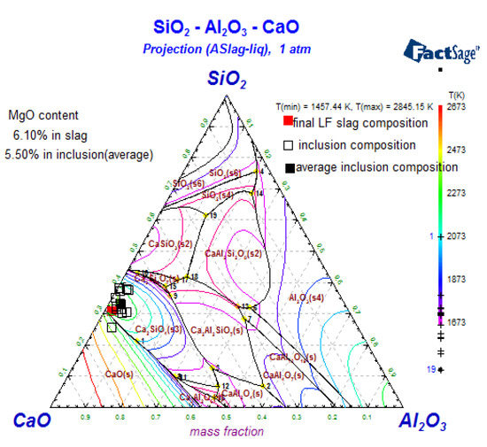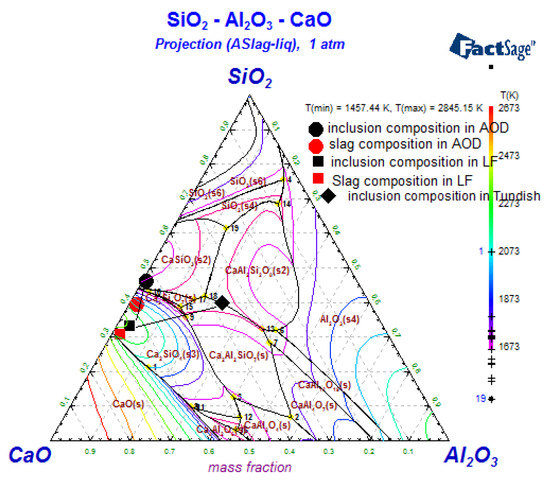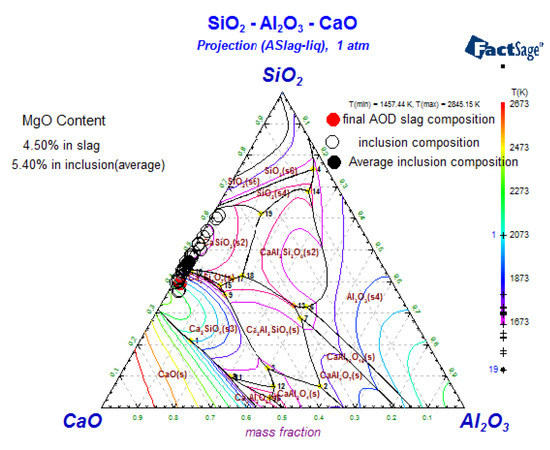To determine the characteristics of the inclusions of the AOD and LF stages, the compositions of inclusions in steel specimens were converted into the mass percentages of CaO, SiO2, MgO, and Al2O3, and then were plotted using CaO–SiO2–Al2O3 ternary system phase diagrams, as shown in Figure 5 and Figure 6. The phase diagram of the CaO–SiO2–Al2O3 system at 1 873 K was calculated using FactSage 6.3 (Thermfact/CRCT & GTT-Technologies, Aachen, Germany) software. It can be clearly seen that the composition of the inclusions was in good agreement with the slag composition. The inclusions are mostly made up of slag components, resulting from slag entrapment. During the cooling process, additional inclusions were formed, such as CaSiO3, containing a higher content of SiO2, and Ca2SiO4, containing a higher content of CaO precipitate. In addition, the Al2O3 content, MgO content, and the basicity of the LF slag were higher than those in AOD. Additionally, the Al2O3 content, MgO content, and the basicity of inclusions in LF were also higher than those in AOD, which is generally consistent with the change of slag composition. Overall, most inclusions during the AOD process were CaSiO3 with a high SiO2 content, and most inclusions during LF were Ca2SiO4, with a high CaO content. At the same time, the amounts of Al2O3 and MgO in inclusions in the AOD and LF stages were lower, similar to those in the slag. Therefore, it can be concluded that the inclusions formed in 304L stainless steel during the AOD and LF processes are mainly derived from the entrapment of the top slag. The strong argon stirring during AOD smelting and LF refining eventually allows inclusions to eventually reach equilibrium after action between the molten steel and slag. Thus, effective control of inclusions can be achieved by the careful control of the slag composition. The content of MgO in the slag in LF is higher than that in AOD (an increase from 4.5% to 6%), suggesting that slag and molten steel corrode the lining in the LF refining process. The erosion from the molten steel is more obvious, and results in a significant increase in the content of MgO in inclusions, so a key control strategy will be to inhibit the erosion of the lining during the refining process. It is worth noting that the Al content comes from the ferrosilicon present in the reaction, so lowering the Al content in the ferrosilicon will limit the formation of Al2O3 inclusions.