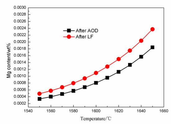 It can be seen from the above results that the levels of Al2O3 and MgO in the LF slag were higher than those in the AOD, and the levels of Al and Mg in the LF were also higher than those in the AOD. The MgO content in the slag is derived from refractory material according to reaction (1), and the Mg content in the steel originates from slag and refractory material, according to reactions (2)-(3). The Al content in steel comes from the ferrosilicon, and the increase in the Al content during refining results from an increase in slag basicity. The effect of slag on the Als and Mg content in steel during the AOD-LF process was calculated using the Factsage 6.3 software. The FTmisc and FToxid databases were used, and the calculation module was equilibrated with 100 g of molten steel. Figure 9 shows the effect of the slag on the Als content when the temperature varied from 1550 °C to 1650 °C. The Als content in steel increased from AOD to LF at the same temperature. After the LF stage, the Als content increased as the temperature decreased. Figure 10 shows the effect of the slag on the Mg content in steel when the temperature varied from 1550 °C to 1650 °C. The Mg content in the steel also increased from AOD to LF at the same temperature. During the AOD-LF process, the Mg content decreased as the temperature decreased.