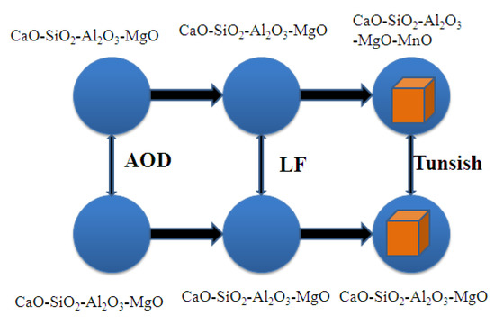 The above results and analysis were used to describe the evolution of the inclusions and the formation mechanism of the inclusions during the smelting process of 304L stainless steel, as shown in Figure 12. There are two main types of inclusions: CaO-SiO2-Al2O3-MgO-MnO and CaO-SiO2-Al2O3-MgO.