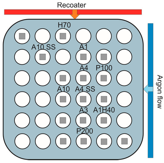 18 cuboids, with a size of 5 × 5 × 15 mm3, were produced in a SLM Solutions 280HL machine (SLM Solution Group AG, Lübeck, Germany) using plasma atomized Ti-6Al-4V ELI grade 23 powder from AP&C. The size distribution of the powder’s spherical particles was measured by laser diffraction (Beckman Coulter LS 13320 PIDS, Beckman Coulter GmbH, Krefeld, Germany), resulting in D-values D10 = 22 µm, D50 = 34 µm and D90 = 46 µm. Table 1 shows the manufacturing parameters. Each sample was produced on a small round-shaped baseplate (Ø = 3 cm), which was screwed to a large baseplate 280 × 280 mm2 preheated to 200 °C (see Figure 1). Since in our previous study [13] the position on the baseplate showed to be an important factor for RS, the location of each sample is uniquely defined (see Figure 1). Two samples were built on a 2 mm support structure (SS). The same powder layer thickness of 30 µm and a chessboard scan strategy with a minimum field size of 5 mm were chosen for all of them, while other processing parameters were varied. Also, for all samples, a set of two contours and one intermediate line (i.e., so called fill-contour line) were applied before the sample bulk was processed. In the contour scan, the same parameters, with 100 W laser power and 525 mm/s scan velocity, were used for all specimens. The microstructure and the RS for some cuboids from the same build job were partially discussed in [13]. The names of the parameter sets were kept the same as used in our previous studies [8,13,22,23] for consistency, and are indicated in Table 1. The A4 parameter set presents porosity-optimized conditions [23], and is always used as a reference.