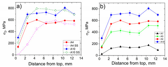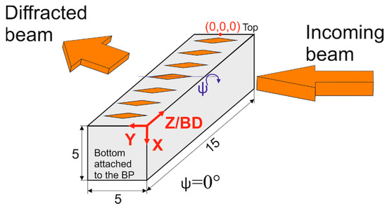 The experiment was performed in a reflection set-up with a fixed diffraction angle of 2θ = 8°. The prismatic gauge volume was defined by the intersection of the incoming (slits 500 × 500 μm2) and the diffracted beams towards the detector (vertical slits of 30 µm). Therefore, a gauge volume length of 3.8 mm was defined (Figure 2), although one has to bear in mind that more that 75% of the signal comes from central 50% of the length [26]. All samples were systematically measured on the surface opposite to the red line in Figure 1. During measurements all samples were attached to the baseplate, also support structures were not removed. All samples, except A4 without contour, were measured at the surface height identified by laser system (0 µm). Seven points along sample height were mapped to obtain the stress component along the building direction (BD, σz, Figure 2). The sin2ψ method was used assuming the normal stress component (σX) negligible at the surface. Diffraction peaks of six crystallographic planes of (α + α’) hexagonal Ti lattices were acquired. For the calculation of strains and stresses, diffraction elastic constants (DEC, reported in [8]) of α-Ti were used. The detailed description of experiment has been reported elsewhere [8,13].
