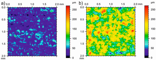 Roughness map of the cuboid (field of view is 2.5 mm × 2.5 mm) for (a) A4 with contour scan Sq = 13.2 µm; (b) A4 without contour scan Sq = 33.3 µm.