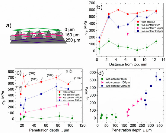 The contour scans are usually applied to reduce roughness of the sample, which is often dominated by the attached/partially unmolten powder particles [34]. However, in order to understand the effect of roughness on RS measurements one A4 sample without contour was investigated in this study. The A4 sample without contour scans was manufactured in a different build job but using the same bulk A4 parameters (Table 1). The surface roughness, obtained by confocal laser scanning microscopy, shows more than double Sq in case of the sample without contour scan compared to the one with contour (Sq = 33.3 µm vs. Sq = 13.2 µm, Figure 4a,b). Also, a higher maximum height Sz for the sample without contour scan (270 µm) compared to one with contour (102 µm) can be observed in the roughness maps. The surface alignment for RS measurements at the EDDI beamline is usually obtained by a laser system for each measurement point of the sample surface. In this way the surface waviness is taken into account. This surface alignment allowed obtaining a sufficient signal. The unmolten powder particles at the surface contribute to the diffraction signal but since they only are partially attached to the surface they do not contribute to macrostress formation, i.e., the RS value should be around zero. Therefore, for the sample without contour scan different depths from the surface, defined by the laser system, were measured (0 µm, 150 µm and 250 µm, see schematic sketch Figure 5a) to assess the influence of roughness on measurements. The 150 µm and 250 µm (Figure 1) correspond to the physical shift of the gauge volume inside the sample from the 0 µm position defined by the laser system. An increase of RS was observed (Figure 5b) by shifting the gauge volume deeper, as well as a decrease of experimental error which is related to the increase of the diffraction peaks intensity. Therefore, the surface RS of the sample without contour scan become close to those in the sample with contour scan at a shift of 250 µm. The stress profile along the sample height still fluctuates, possibly due to the inhomogeneous roughness/waviness. Additionally, the gradient of RS as a function of penetration depth shows that closer to the surface the partially attached powder particles contribute to the signal and reduce RS (Figure 5c) [8,9]. Therefore, the choice of the α-103 reflection minimized the influence of intergranular stresses, while it had the highest penetration, helping to overcome the problem of high roughness. The penetration depths of high energy X-ray into the material count from the center of the gauge volume (i.e., from 0, 150, 250 μm positions). Interestingly enough, for the sample without contour a RS value with gauge volume at 150 µm and the penetration depth of τ = 100 µm is approximately the same as the first RS value of gauge volume at 250 µm (τ ≈ 20 µm). Indeed, the combination of the RS profiles from Figure 5c, considering the physical shift from the surface and penetration depth of the X-ray beam, shows an increase of RS as function of depth (Figure 5d). This proves the concept of continuous RS gradient.