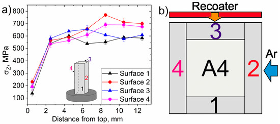For the comparability of results, the lateral surface opposite to the red line in Figure 1 and Figure 6 (named surface 1) was measured for all samples presented in this study. However, to check the distribution of RS at different sides of samples, all four lateral surfaces of cuboid A4 were measured (Figure 6). To avoid the effect of laser path and location of the sample on the baseplate (discussed in [13]) the sample was taken from the center of the baseplate, where we can assume negligible changes in laser orientation as it reaches the sample. The evolution of RS on the different surfaces shows the same tendency from the top of the sample to the mid-height (up to Z = 7 mm, see coordinate system in Figure 2), although with a scatter of about 100 MPa. However, in the lower part of the sample (Z > 7 mm) the curves split in two groups: Surfaces 1 and 3 show lower stresses (around 550 MPa) while surfaces 2 and 4 show higher values (up to 775 MPa). Thus, surfaces opposite to each other have similar RS, hence experience similar temperature distribution during production. Indeed, the surfaces 2 and 4 oriented perpendicular to Ar flow while 1 and 3 are parallel to it. After the contour scan, surfaces 2 and 4 may cool faster due to the larger surface cross section in contact with Ar flow, which results in a higher temperature gradient and hence higher RS (Figure 6b). Additionally, as observed by X-ray computed tomography, porosity distribution has not shown any pattern that can be related to stress relaxation (see Figure 5c in [13]). As shown in [35] for LPBF AlSi10Mg, the two surfaces facing Ar flow output (surface 2) and opposite to it (surface 4) have the highest difference in the roughness. In our case, roughness measurements were performed at each lateral surface and summarized in Table 2. The surface roughness values were similar for all surfaces of cuboid A4. This fact eliminates the effect of roughness on RS measurement in this case. Also, while the bulk scanning strategy was not the same for every side (since the chess pattern with rotation was used), it is difficult to assess any effect of the scanning strategy, since the rotation homogenizes the final temperature distribution. We can conclude that other factors influencing RS at different lateral faces of a sample, such as roughness and scanning strategy, seem to have a minor role with respect to Ar flow. Yet deeper investigations are needed together with a systematic analysis of the Ar flow paths.