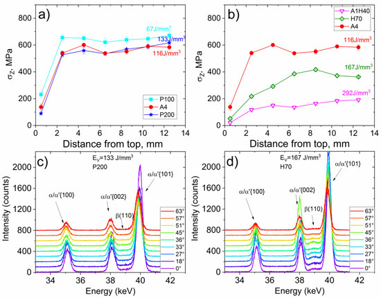 RS along the building direction for (a) laser power variation study, (b) hatch distance variation study; diffractograms for (c) P200 sample; (d) H70 sample (the ψ-tilt angles are indicated in the insets).