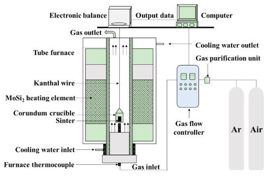 The ironsand used in the paper came from East Java in Indonesia. Table 1 gives the chemical composition of ironsand determined by chemical analysis and fluorescence analysis (XRF-1800, Shimadzu, Kyoto, Japan). The results indicated that the ironsand had a high content of TiO2 and FeO. The mass fractions of Fe3+ and Fe2+ were 26.03% and 29.60%, respectively. The oxidation kinetics of the ironsand pellets were studied by conducting a series of oxidation experiments performed in an electric tube furnace in Figure 1. Ironsand with sizes less than 74 μm was obtained through fine grinding and screening. Then the ironsand (50 g) and deionized water (4 mL) were mixed thoroughly. A total of 15 g of the blended mixture was pressed into a cylindrical block with a height of 10 mm and a diameter of 20 mm under the pressure of 10 MPa. After that, the pellets were dried in an oven at a constant temperature of 105 °C for 3 h to remove the free water. During a typical oxidation experiment, a pellet was placed in an iron–chromium–aluminum alloy wire basket and preheated under a protective atmosphere of Ar (3 L/min). The sample was then preheated to the target temperature. Subsequently, the gas was switched to compressed air with a flow rate of 5 L/min for 30 min. After oxidation, the samples were cooled to room temperature under an atmosphere of Ar (3 L/min). Each test was carried out three times and the mean was taken to remove any discrepancies.