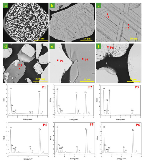 Figure 3 gives the microstructures of the ironsand. As can be seen from Figure 3a, the shapes of the ironsand particles were mostly regular and had smooth surfaces. The particle diameter varied from 100 to 300 μm. SEM patterns in Figure 3 suggested that iron oxides in ironsand had two different kinds of microstructures. One was particles with the layered phases deposited on the substrate at an angle, as shown in Figure 3b,c. The EDS results in Figure 3 (P1, P2) indicated that the substrate was titanomagnetite (TTM) and the layered phase was titanohematite (TTH). Another was a homogeneous particle with smooth surfaces and relatively average element distribution, as expressed in Figure 3e,f. The EDS results in Figure 3 (P4, P6) confirmed the main phase in the homogeneous particle was TTM. The EDS patterns in Figure 3 (P3, P5) confirmed the existence of enstatite, which was consistent with the results of XRD. More remarkable, the EDS results showed that a small amount of Mg, Al, and V existed in iron oxides to form the complex solid solution.