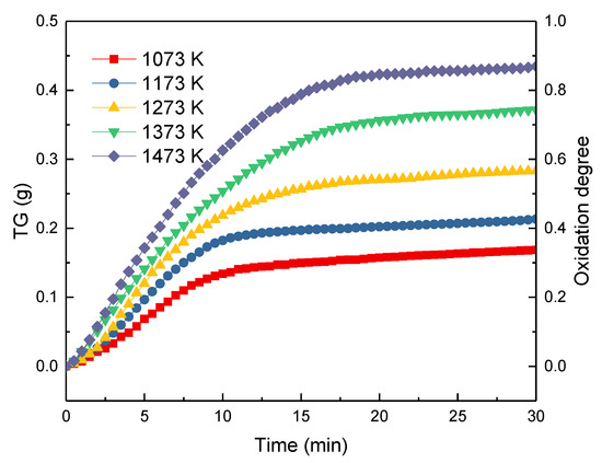 Figure 5 gives the TG curves and the oxidation degrees during the oxidation of ironsand in the air at the temperatures ranging from 1023 to 1423 K. Due to the oxidization of Fe2+ in the ironsand, the weight of each sample increased as the reaction proceeded. The results also indicated that the increase in reaction temperature could accelerate the oxidation rate. For all the pellets, the reaction rate reached the maximum at the beginning of the reaction and gradually decreased with time. This was mostly because the growth and recrystallization of hematite in the pellets, as well as the formation of silicate liquid phase, promoted the bonding of the small particles. As analyzed in Section 3.2., the shrinkage and consolidation of the pellets could reduce the porosity and prevent the diffusion of the air, which slows down the oxidation rate. As described in Equation (1), the oxidization degree of the pellets defined as . and respectively represent the mass increase of the pellets and the theoretical maximum increase of the sample mass. As shown in Figure 5, the change rule of the oxidation degrees at different temperatures tends to follow lines similar to the TG curves in Figure 5. The maximum oxidation degrees of the pellets at different temperatures can be obtained in Figure 5. The results further confirmed that the increase of the oxidation temperature could significantly promote the oxidation degree of the pellets from 0.3426 to 0.8833.