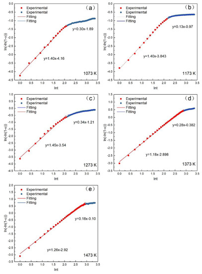 The relation between and lnt at different temperatures. (a) 1073 K; (b) 1173 K; (c) 1273 K; (d) 1373 K; (e) 1473 K.