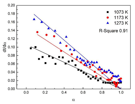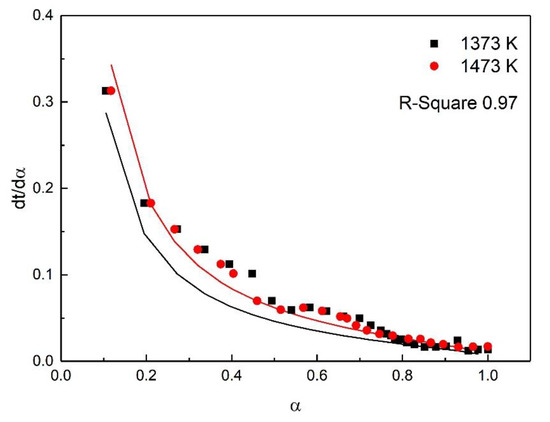 For the study of reaction kinetics, researchers have developed a lot of models. As summarized in Table 4, these models can be categorized into nucleation, geometric contraction, diffusion, and reaction-order models [23]. All the models in Table 4 have been tested for the reaction. The calculated data of different mechanism functions indicated that the chemical reaction mechanism for the early stage of the oxidation fit A2 well with the R-square value of 0.90, the chemical reaction mechanism for the post-oxidation at 1073–1273 K fit F1 well with the R-square value of 0.91, and the chemical reaction mechanism for the post-oxidation at 1373 and 1473 K fit D4 well with the R-square value of 0.97. The comparisons between the theoretical curves and the experimental curves for the early stage of the oxidation, the post-oxidation at 1073–1273 K, and the post-oxidation at 1373 and 1473 K are drawn in Figure 7, Figure 8 and Figure 9, respectively. The activation energies of ironsand pellets were calculated by using the model-function method. For the early stage of the oxidation, the reaction mechanism was random nucleation and nuclei growth (A2) due to the formation of new phases which was consistent with the results of the study [24,25]. For the post-oxidation, the reaction mechanism was chemical reaction (F2) at the temperatures of 1073, 1173, and 1273 K. As indicated in Figure 6, the increase of oxidation temperature could significantly increase the oxidation degree. This means that for the post-oxidation at the relative low temperature, the oxidation of ironsand pellets was mainly controlled by chemical reaction. However, with the increase of reaction temperature, the reaction mechanism was the three-dimension diffusion control (D4) at the temperature of 1373 and 1473 K. Due to the growth and recrystallization of hematite, as well as the formation of silicate liquid phase, the porosity of the pellets sharply decreased, which prevented the air diffusion inside the pellets and slowed down the oxidation rate. Table 5 summarizes the apparent activation energy obtained through Equation (7). The calculation results were as follows: for the early stage of the oxidation E = 15.39 kJ/mol, and A = 0.77; for the post-oxidation at 1073, 1173, and 1273 K, E = 34.29 kJ/mol and A = 4.97; for the post-oxidation at 1373 and 1473 K, E = 13.88 kJ/mol and A = 0.23.