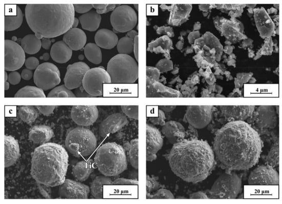 In this study, experiments were carried out in an argon atmosphere with 316Lss spherical powder with the size of 45 μm. As shown in Figure 1a, the average particle size of TiC powder is between 2 μm and 5 μm (Figure 1b), as raw material. Three different TiC/316L composites containing 0 wt%, 2 wt% and 4 wt% TiC particles were prepared by milling TiC and 316Lss powders in a Pulverisette 4 ball mill (Fritsch GmbH, Germany). The grinding process was carried out in an Ar protective atmosphere. The ball was stainless steel. After milling for eight hours, the TiC particles corresponding to the enhanced concentration of 2 wt% and 4 wt% TiC were evenly attached to the 316Lss, which made the TiC/316Lss composite powders have excellent fluidity (Figure 1c,d); the chemical composition of the experimental 316Lss powder is shown in Table 1.