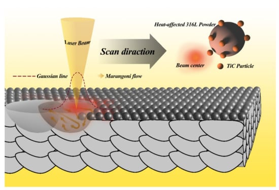 In addition, the performance of SLM-formed 316Lss was improved after adding a ceramic reinforced phase. Stašić et al. reported the effect of adding NiB on the microstructure of SLM-formed 316Lss parts. It was confirmed that the addition of NiB could better improve the surface quality and mechanical properties of 316L stainless steel parts []. Yadollahi et al. demonstrated that the microstructure and friction and wear properties of titanium and tin coatings are improved with the increase of plasma nitriding temperature and laser power []. Almangour et al. reported the effect of the addition of TiB2 on the microstructure and mechanical properties of SLM-formed nanocomposites; TiB2/316L nanocomposites have a higher microhardness and yield strength, lower friction coefficient, and lower wear rate than SLM-processed 316Lss samples []. Song et al. clarified that adding SiC to an Fe matrix results in a significant increase in local melt instability, viscosity, and tensile strength []. Almangour et al. reported that the mechanical and tribological properties of 316Lss nanocomposites are gradually improved with the increase of TiC and TiB2 volume fractions []. According to previous studies, the addition of the reinforcing phase can improve the mechanical properties. However, there are few studies on the formation of TiC-reinforced 316Lss composites formed by SLM.