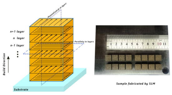 All of the samples were made using an SLM system (Renishaw AM 250, Renishaw, London, UK), which was equipped with a YLR-400 fibre laser that was conducted under Ar gas protection. The focused beam diameter was 70 μm. Samples were produced with a scanning speed (v) of 1200 mm/s, a laser power (P) of 200 W, a hatch spacing of 60 μm (h) (the distance between two adjacent scan vectors), and a layer thickness of 30 μm (t). Figure 2 shows a schematic diagram of the printing process. An alternate-hatching scanning pattern was applied, and the scanning direction rotation was 90° between each layer, as shown in Figure 3. Cube specimens with a size of 10 × 10 × 10 mm were manufactured. This parameter set was determined to obtain high-quality TiC/316Lss products.