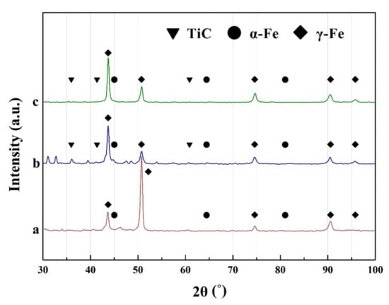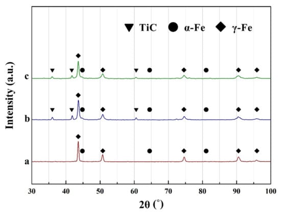 X-ray diffraction (XRD) data of TiC-reinforced composite powders with mass fractions of (a) 0% TiC, (b) 2 wt% TiC, and (c) 4 wt% TiC.