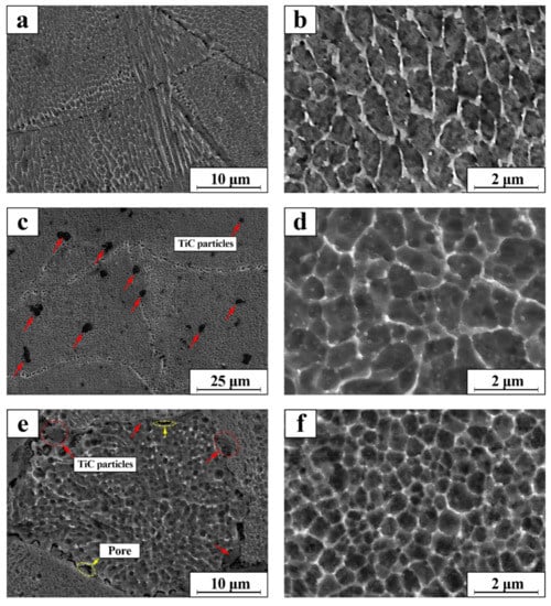 SEM micrographs of the TiC/316Lss composites formed by SLM; (a,b) 0 wt% TiC, (c,d) 2 wt% TiC, (e,f) 4 wt% TiC.