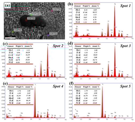 High magnification SEM images of the side views of the 2 wt% TiC/316L composites formed by SLM (a); and energy-dispersive X-ray spectral (EDS) spot analysis of (b) Spot 1; (c) Spot 2; (d) Spot 3; (e) Spot 4; and (f) Spot 5.