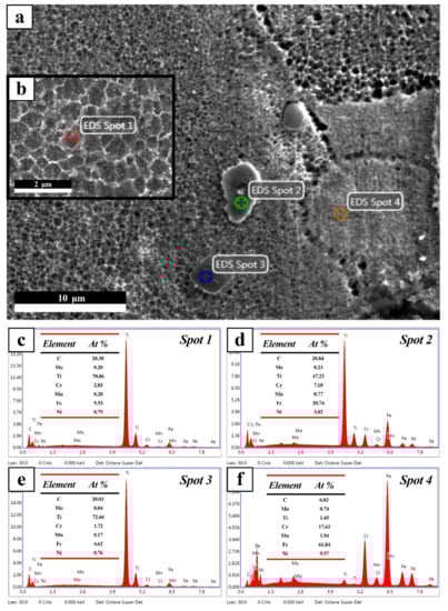High-magnification SEM images of the side views of the 4 wt% TiC/316L composites obtained by SLM (a,b); and EDS spots analysis of (c) Spot 1; (d) Spot 2; (e) Spot 3; and (f) Spot 4.