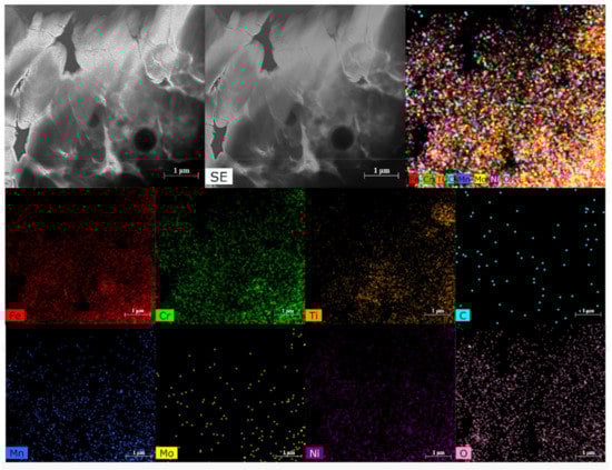 Figure 9 shows the TEM micrographs and EDS element mapping of 2 wt% TiC/316Lss formed by SLM, and the microstructure corresponding to different element types is further clarified. The results show that the main elements in the bulk materials were distributed evenly. Under the same magnification, the Fe, Ti, and C energy spectra clearly show the 316Lss phase and TiC phase. By combining the SEM microstructure and the EDS map, it was confirmed that TiC/316Lss composites were formed by SLM, and the elements were evenly distributed, which greatly enhanced the mechanical properties of the composites.